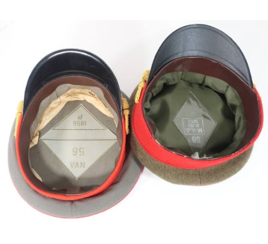 OC608.)TWO (2) EAST GERMAN VISOR CAPS: both are DDR National People's Army officer's visor caps with gold celleon chin cord. One is 1950 dated and is a size '56' while the other later DDR period cap is a size '58'. Both caps are in a superb state of preservation. EXC++++