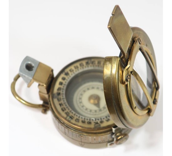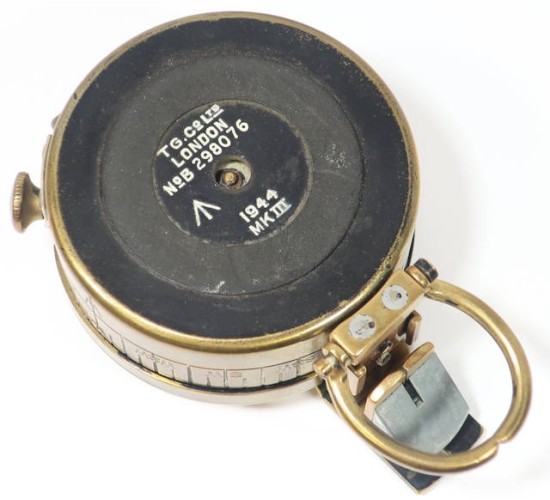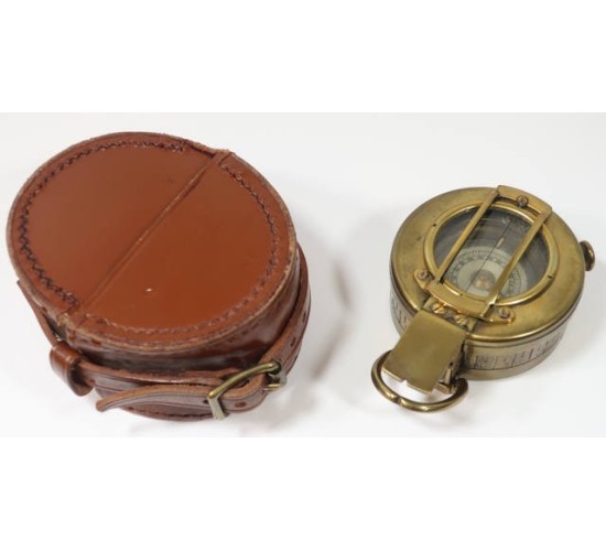 OC612.)WWII BRITISH ARMY MARCH COMPASS: 1944-dated and housed in its original brown leather case. A real treasure and in a superb+ state of preservation. With gimbal floating white dial and pointer. Reads true magnetic north. 2 1/2" wide solid brass body, 1 1/2" tall and with large brass loop for lanyard. Has hinged lid that flips up showing reticule, hinged sight on the opposite side. Underside of frame is marked with British army issue 'Broad Arrow Proof' and this instrument's designation 'MKIII'. Dated '1944' and with maker 'TG.Co. Ltd., London'. Also serial numbered '298076'. Brown leather case is soft and supple and entirely intact. Has brass adjustment buckle and leather tightening tab. EXC++++