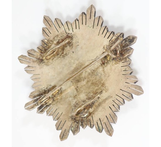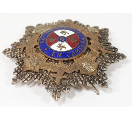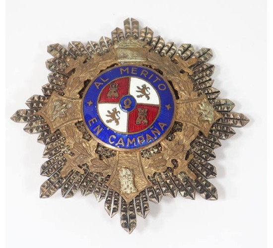 OC613.)SPANISH CIVIL WAR SPANISH WAR CROSS BREAST STAR: a stellar 1930's era specimen with side hooks on the back. 62mm wide and highly vaulted. Awarded en masse to the Condor Legion and known in German as the Spanische Kriegerkruez. Constructed of a quality nickel-silver alloy and with separately applied glass enameled boss in center. Shows the royal Spanish coat-of-arms (rampant lions and fortress towers). With latin motto around border 'AL MERITO EN CAMPANA' (For Meritorious Performance in the Field). With stamped gold alloy wreath having cross swords. Starburst bae is heavy and solid, impressive. Reverse has long pin that curves up at top. Two rivets on the reverse and side hooks. EXC++++