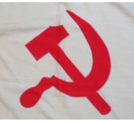 OC614.)SOVIET RUSSIAN COLD WAR NAVAL FLAG: for the Russian naval chief of staff, a supremely high Soviet position. Typical nautical wool construction with 35x54"dimensions being and double-sided details. Fashioned of two separate panels machine sewn together -- one white, one blue -- and showing communist hammer and sickle along with red Soviet star superimposed with anchor surrounded with wreath. Has tan canvas bunting with rope loops at ends. Printed on bunting with red ink Russian cyrillic characters. As was common with so many Soviet Russian and East German military items this flag was tailored identically to a German 3rd Rch nautical standards having separately machine sewn on woolen cloth panels in the corners and parallel rows of machine stitching on the tips....both designed to prevent wear from wind-whipping. Clean, no mothing. EXC++++