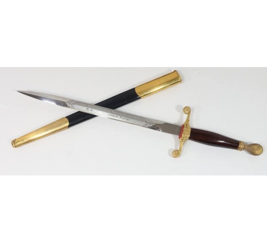 OC615.)CASED RAF BATTLE OF BRITAIN COMMEMORATIVE PRESENTATION DAGGER: superlative quality piece and the product of the premiere Wilkinson armory. This dagger was presented to RAF Battle of Britain aviation veterans. I don't know the date of this post-war presentation dagger but I'd suggest that it's circa 1965 (25th anniversary of the B of B). It's certainly old and aged and not a more recent piece as perhaps 1990 (50th anniversary). 16" long overall and being a medieval dirk design. Just radiates quality....if made more recently it would not likely show such quality of material and construction. Shows a beautiful nickel-plated steel blade etched on both sides with decorative panels. On one side is inscription 'DEDICATED TO THE ROYAL AIR FORCE VICTORS OF THE BATTLE OF BRITAIN 1940' while the reverse side is etched with 'For Outstanding Service to the RAF Benevolent Fund'. With handsome frosted gold cross-guard adorned with acanthus details; gold pommel now toned with tarnish. Smooth dark brown teak wood grip; flawless with no cracks nor any chips. Reverse ricasso is etched with British royal crest and 'By Appointment' along with maker 'Wilkinson Sword, London' as well as 'Made in England'. Comes in 5x18" hardwood case, hinged and with catch at front (missing one of the catches). On lid is frosted gold RAF wing design (with WWII King's crown). Inside is lined with sky blue satin and has cradle that holds dagger in place. Two gold coin-like medalions on the insdie lid....one with Churchill profile and the other being a Battle of Britain memorial 'Battle of Britain 1940, Their Finest Hour'. There was another plaque in place that's missing. Only glue residue remains. Note the link below to Sandhurst Military Auctioneer's website showing one of these having sold for $1,900 (South African $'s).