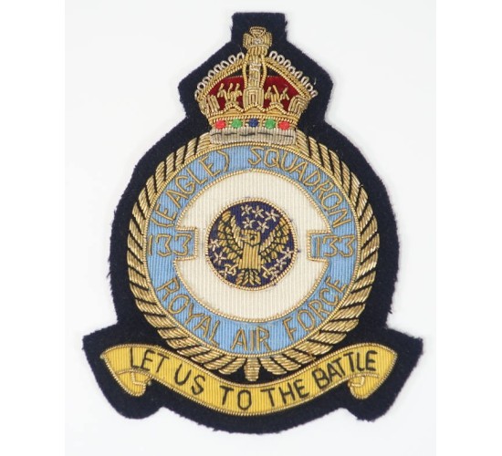 OC617.)RAF EAGLE SCQUADRON US VOLUNTEER'S POST-WAR JACKET PATCH: as worn by US volunteer aviators who fought with the RAF during the Battle of Britain. Large bullion wire hand embroidered patch on cut-to-shape black wool underlay. With bullion king's crown above and hand embroidered scroll below 'LET US TO THE BATTLE'. In center is hand embroidered gold bullion wire American eagle motif. Gold bullion wire hand embroidered details around the center 'EAGLE SQUADRON 133 ROYAL AIR FORCE'. Has black cloth backing material. Circa 1990 from the 50th anniversary of the B of B. EXC++++