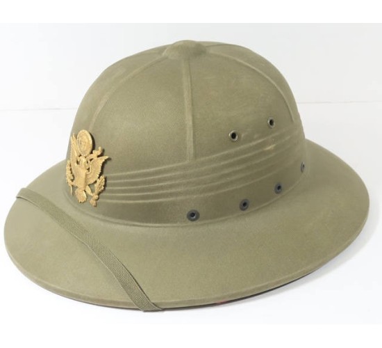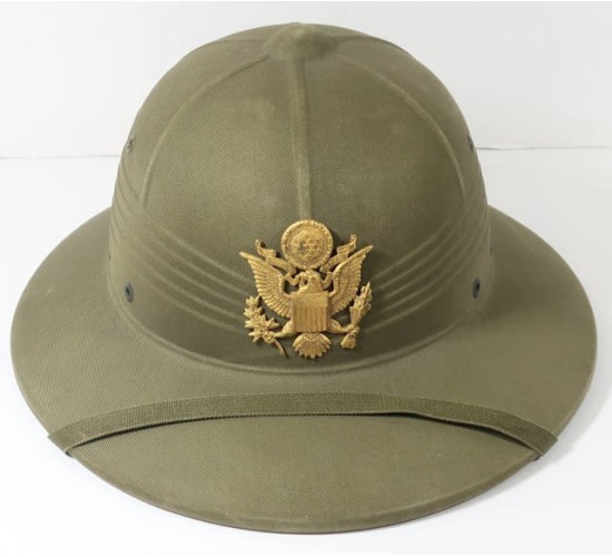 US627.)WWII US ARMY OFFICER'S SUN HELMET: in a superb state of preservation. Olive-green hard canvas body intact and perfect. With OD finished ventilation grommets at sides. Canvas chin strap with metal adjustment buckle. Ersatz brown leather sweat band inside. At front is large gold finished American eagle device, screw-back with bass locking nut. Inside is faintly marked with maker 'International Hat Company' and dated 'Jan. 1944'. Clean. EXC++++