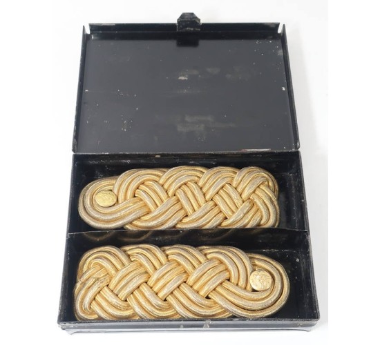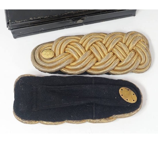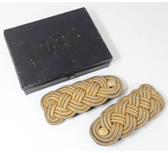 US632.)BOXED CIRCA 1900 US ARMY OFFICER'S SHOULDER KNOTS: matched pair in their 5x7" black finished, hinged, metal box. Shoulder knots are circa 1900 and are gold bullion braided cord with black wool underlay. Each has black wool tongue and American eagle shoulder buttons (which are slightly mis-matched). Lid is marked with New York City military outfitter 'RIDACOCK & Co., 112 4th Ave. NY'. EXC+++