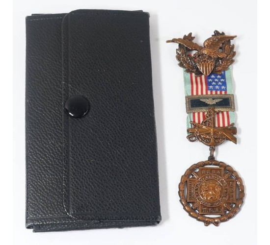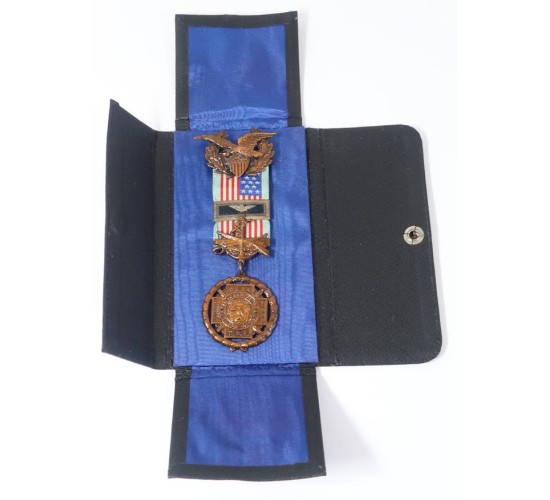 US633.)SPAN-AM WAR UNITED VETERANS POST CMDR'S MEDAL: gem quality specimen for post commander, United Spanish War Veteran's League. 4" long overall with embroidered American flag silk ribbon (infantry blue side stripes). All of the bronze fixtures are burnished. American eagle at top with wreath and shield; central suspension is panoply of arms and anchor. In center is army officer's shoulder board device with miniature silver colonel's eagle device. Comes in its black leatherette case with blue satin interior, snap button catch. EXC++++