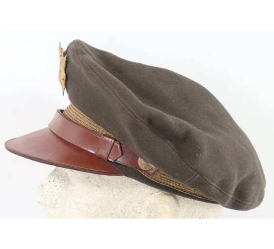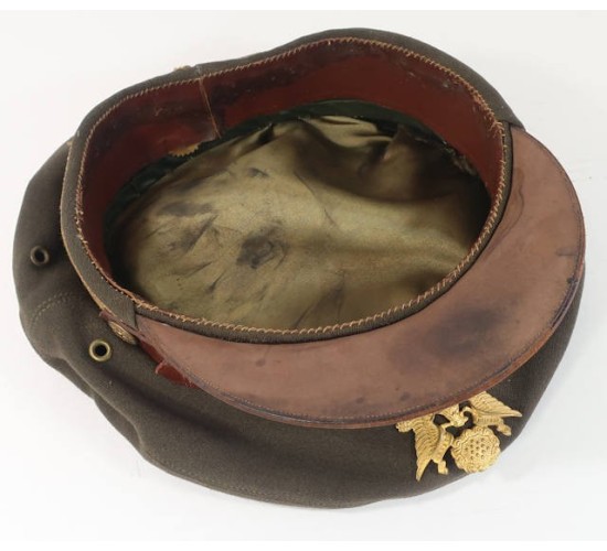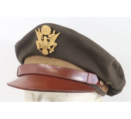 US636.)WWII USAAF PILOT'S CRUSHER CAP, AUSTRALIAN-MADE: fine officer quality chocolate brown wool. Shows a great crusher profile and shape, salty too. Has light khaki shade mohair wool cap band. Ventilation grommets on each side and with russet brown leather chin strap fastened at sides with officer type, gold American eagle buttons. At front is gold-finished American eagle device, screw-back with brass locking nut. The threaded screw-post on this eagle was period repaired; resoldered. Smooth brown leather visor shows wear and age. Interior of cap is lined with OD satin and has genuine brown leather sweat band. All the stitching on band is intact and strong. Printed inside crown with 'Authorized U.S. Army Officer's Cap' and 'Made by Jones Brothers, Limited' with Australian maker 'Surrey Hills, Sydney'. No mothing to wool. EXC+