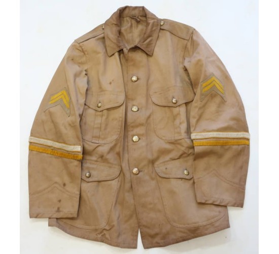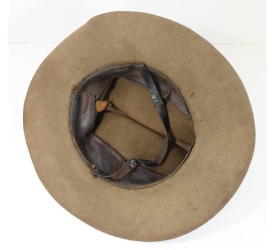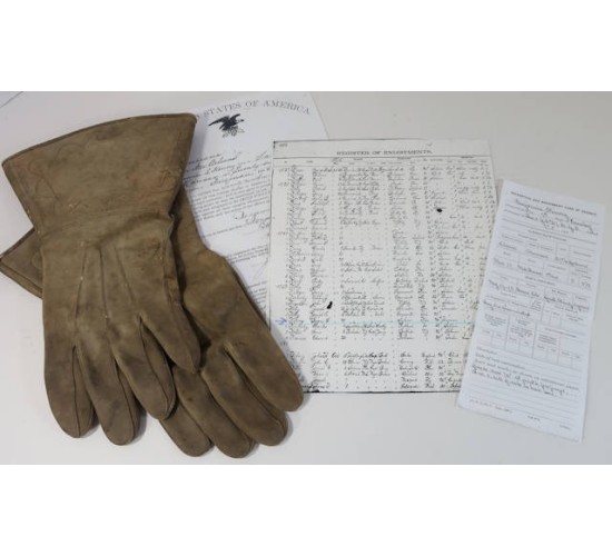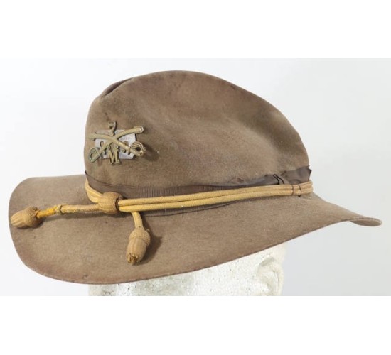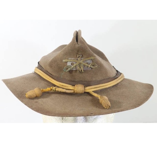 US638.)SPANISH-AMERICAN WAR US.ARMY CAVALRY NAME-IDENTIFED GROUPING: consists of this cavalryman's tunic, gloves and campaign hat. Belonged to corporal Benjamin Kinney who served with the 7th US Cavalry and was posted at Fort Grant, Arizona Territory and then shipped out for Cuba 1899. Comes with photocopied paperwork detailing all aspects of this man's service. Shows that he enlisted at Denver, Colorado on 'May 19th, 1898'. Shows too that he was inducted into the '7th Regiment of Cavalry'. He was discharged at 'Fort Oglethorpe, GA Sept 28th, 1905'. Served with the 12th US Cavalry too. The 7th US Cavalry departed Savannah, GA January 1899 and arrived at Havana, Cuba (Camp Columbia....M Company/7th US Cavalry). He then re-enlisted at New Orleans and was discharged from the US 21st Infantry Regiment in 1905. His tunic is 4-pocket khaki with gold finished American eagle buttons which are removable for laundering (have cotter pins on the backs). With buttoned shoulder straps; upper pockets are pleated while the lower ones are cargo type....all four with buttoned flaps. Rank chevrons are yellow woolen felt on khaki underlay and are machine sewn on. At lower sleeves are horizontal stripes for service in both the cavalry (yellow woolen felt) and infantry (above with white center bar). Tunic soiling from use, no rips nor any holes. His Spanish-American War campaign hat (itself easily worth over $1k!...try finding one of these) is salty and worn. Just radiates originality. With yellow cap cord for cavalry, wear and age. Sides of campaign hat show that typical and correct salt and pepper shaker ventilation holes. At front is US Army cap device - screw-back -- for M Company/7th US Cavalry. Nice. Interesting to note that corporal Kinney placed a safety razor blade behind this cavalry cap device. It's been there since the beginning of time. At first I thought it was a metal plate but upon closer examination I have noted that it's a safety razor blade. No doubt for self-defense if and when needed. The blade is ancient and if you examine it closing the statement on it states that it's not to be 'honed or strapped' (that is, not to be sharpened). Inside of hat has brown leather sweat band that shows wear and age, salty. Stitching is strong. Has its original brown leather chin strap, intact. Included too are his cavalryman's leather gloves. These show the expected wear and age from use but are soft and supple and intact. One is hand inscribed with ancient india ink 'Government Issue 1905 to Corporal Kinny, B.of 12 Cavalry, Ft Oglethorpe, FA'. EXC++++